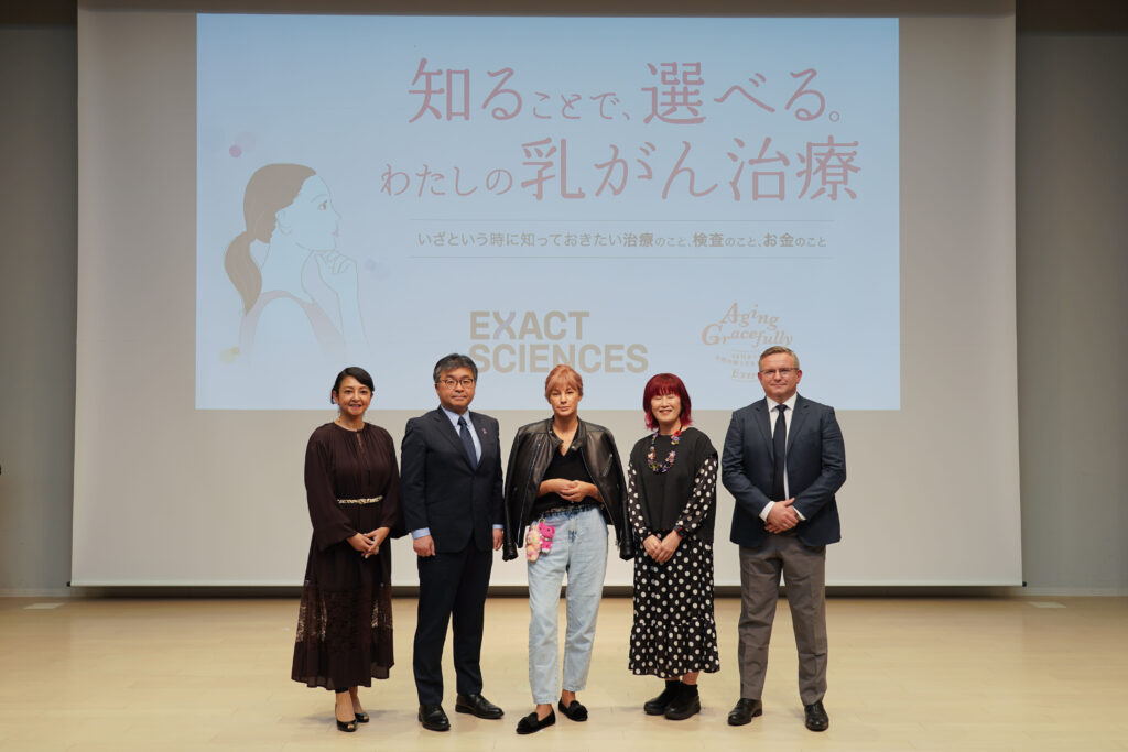 前半は兵庫県立がんセンターの松本光史先生による「乳がんをよりよく治す~薬物治療と多遺伝子検査~」の講演、後半は梅宮アンナさんを招いてのトークセッション「一緒に学ぶ乳がんの『治療のこと』『検査のこと』『お金のこと』」が行われました。患者代表として一般社団法人ピアリング理事 林恵理さんが登壇し、自身の乳がん治療における治療選択について語りました。